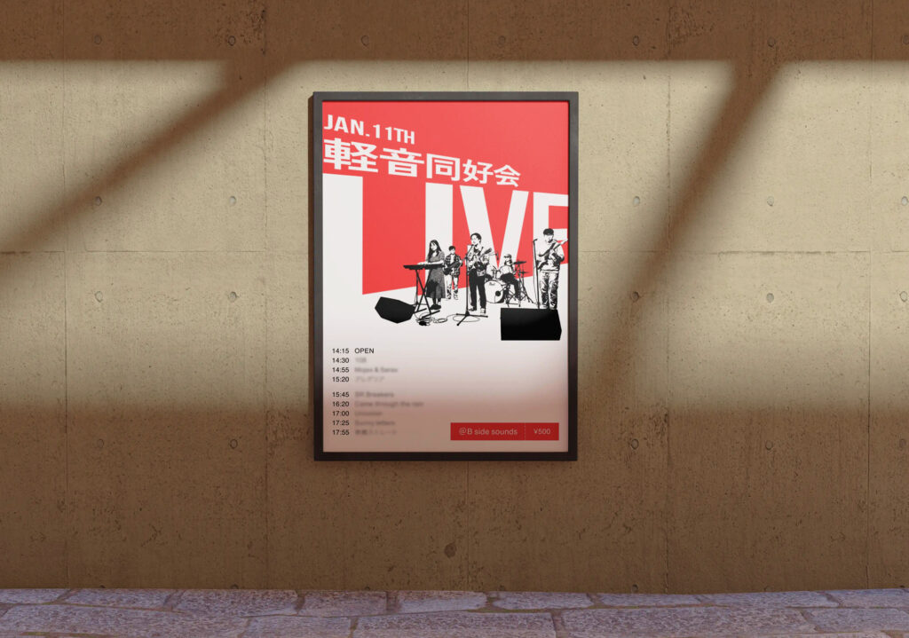 一目で軽音ライブの告知であることが伝わるよう「軽音同好会 LIVE」の文字を最も強調しました。